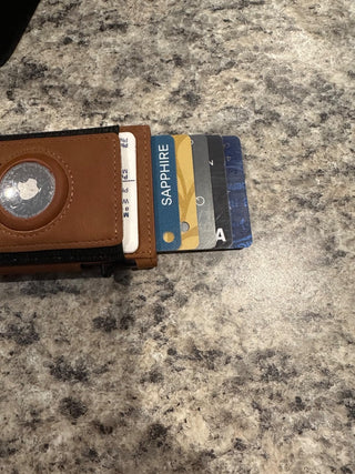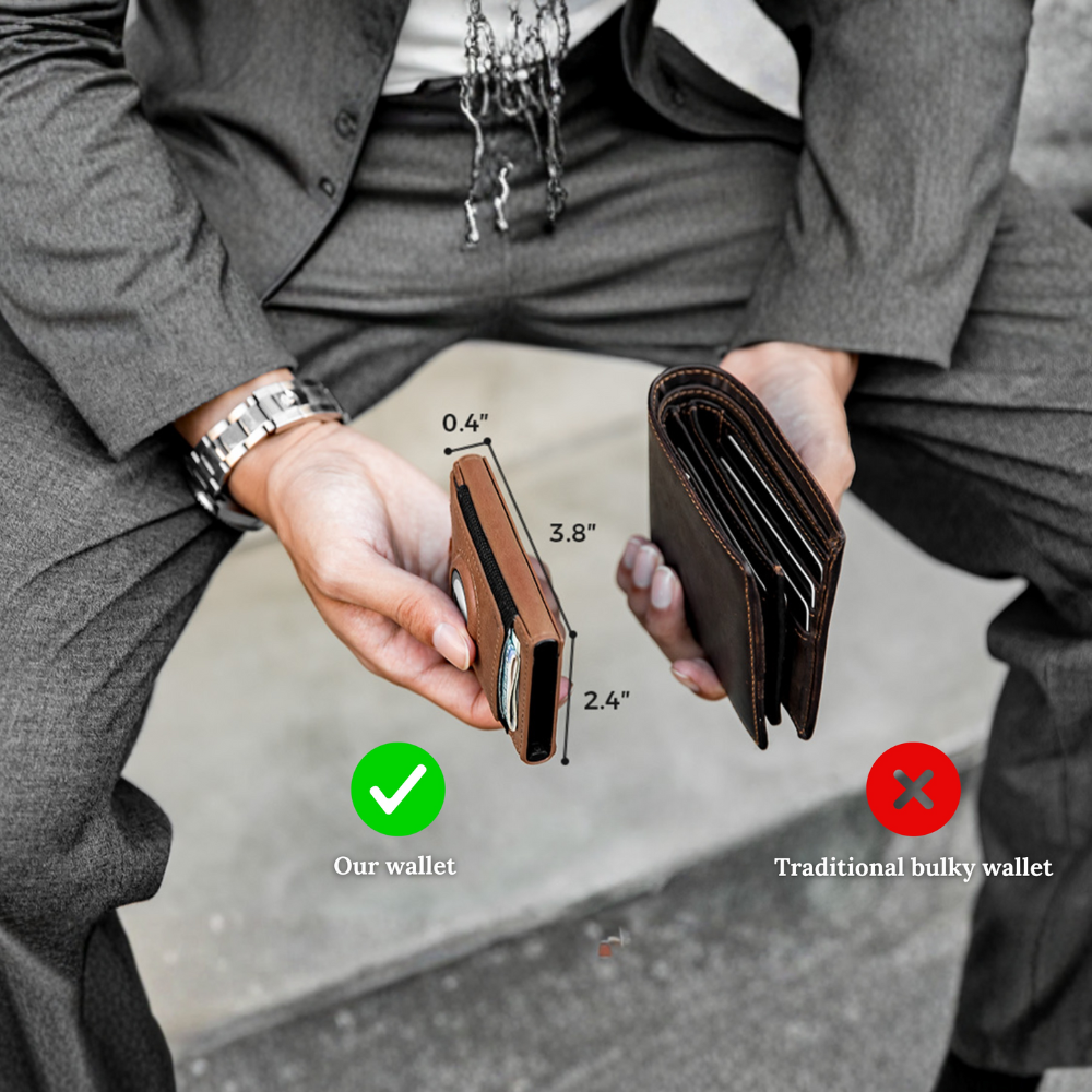 SS. McCaslinVerified BuyerGreat minimal wallet with place for an Air-Tag"This slim wallet with its air-tag holder is a great invention. The wallet is well-made and should last a long time. It is all leather and so slim it can fit easily into a pocket. The wallet itself is impressive. My nephew fell in love with it. He immediately put an air tag into the built-in holder - it works as it should and easily fits into his pocket while working. He prefers it over his other wallets. The cards stay in place and the air tag alerts if it’s left behind. This is a well-thought-out and made product for men who need a small, but easily findable wallet."