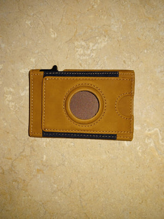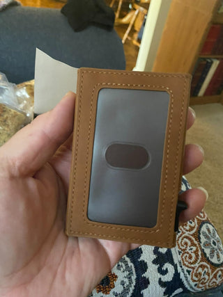 MMichSnowVerified BuyerCompact wallet"This wallet is for those who just want to carry around their license, credit card, and maybe some bills. This wallet is made of a brown suede material. It has a small round pocket to put an Apple Air tag in it. It also has a dedicated pocket for your driver license. It can hold up to 5 credit cards int the slot, and when you press down on the side lever, the credit cards slowly move up."